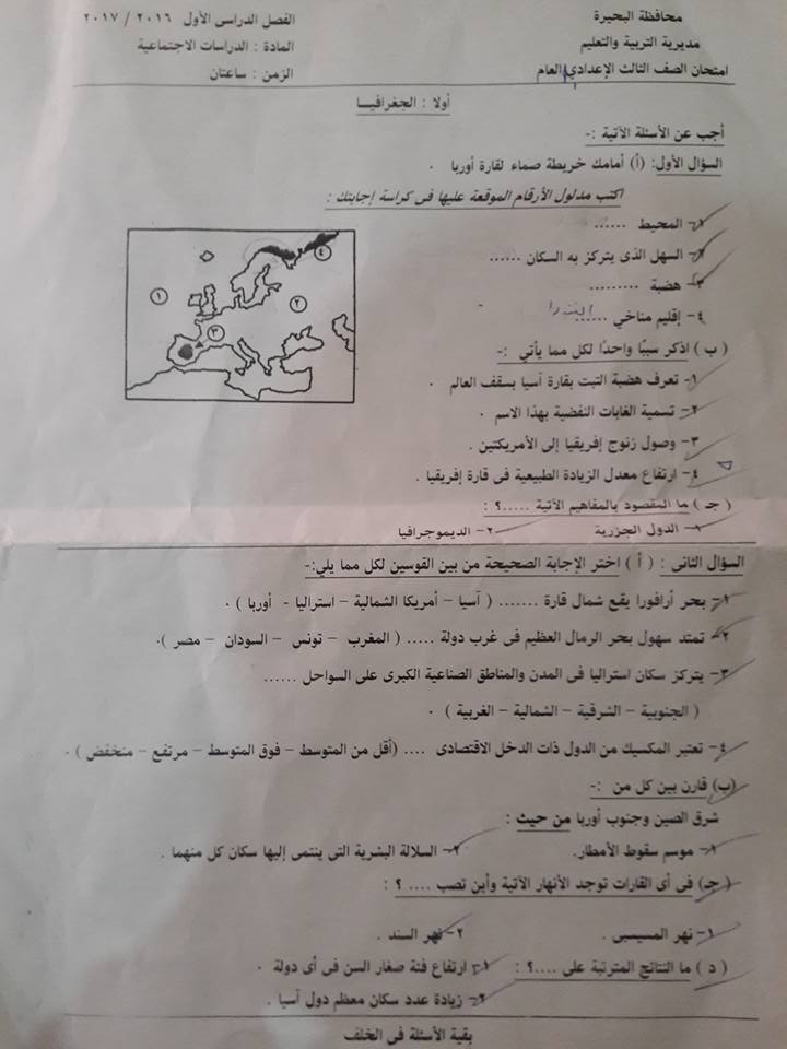 الدراسات الاجتماعية امتحان الدراسات الاجتماعية للصف الثالث الاعدادى محافظة البحيرة الترم الاول 2016